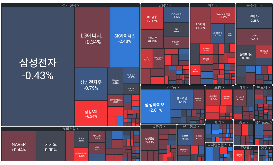 - 우연찮이 보게된 국내증시 맵. 시각화를 통해 흐름을 파악하는데 용이하다. 비중과 섹터 그리고 주가 변동을 쉽게 보여준다.