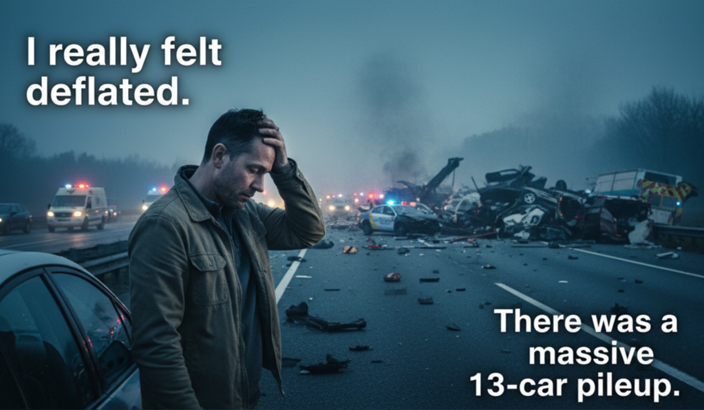 [한글 번역]: 고속도로를 운전하고 있는데 갑자기 제 바로 앞에서 엄청난 13중 추돌 사고가 발생했어요. 저는 멈춰서 사고 현장을 지켜봐야 했죠. 다행히 심각하게 다친 사람은 없었지만, 그 모든 피해를 보니 저는 정말 기운이 빠지고 피해자들에게 안타까운 마음이 들었습니다.