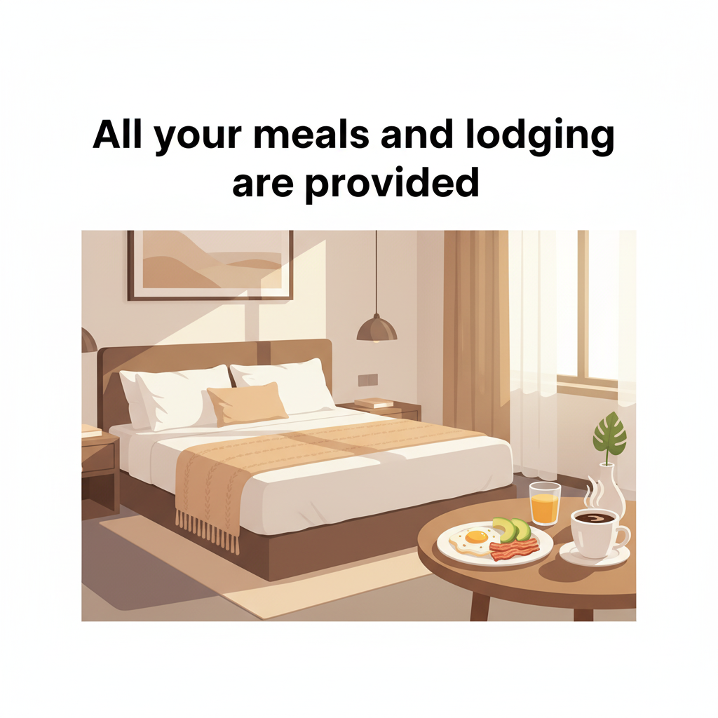 - 당신의 모든 식사와 숙박이 제공됩니다.