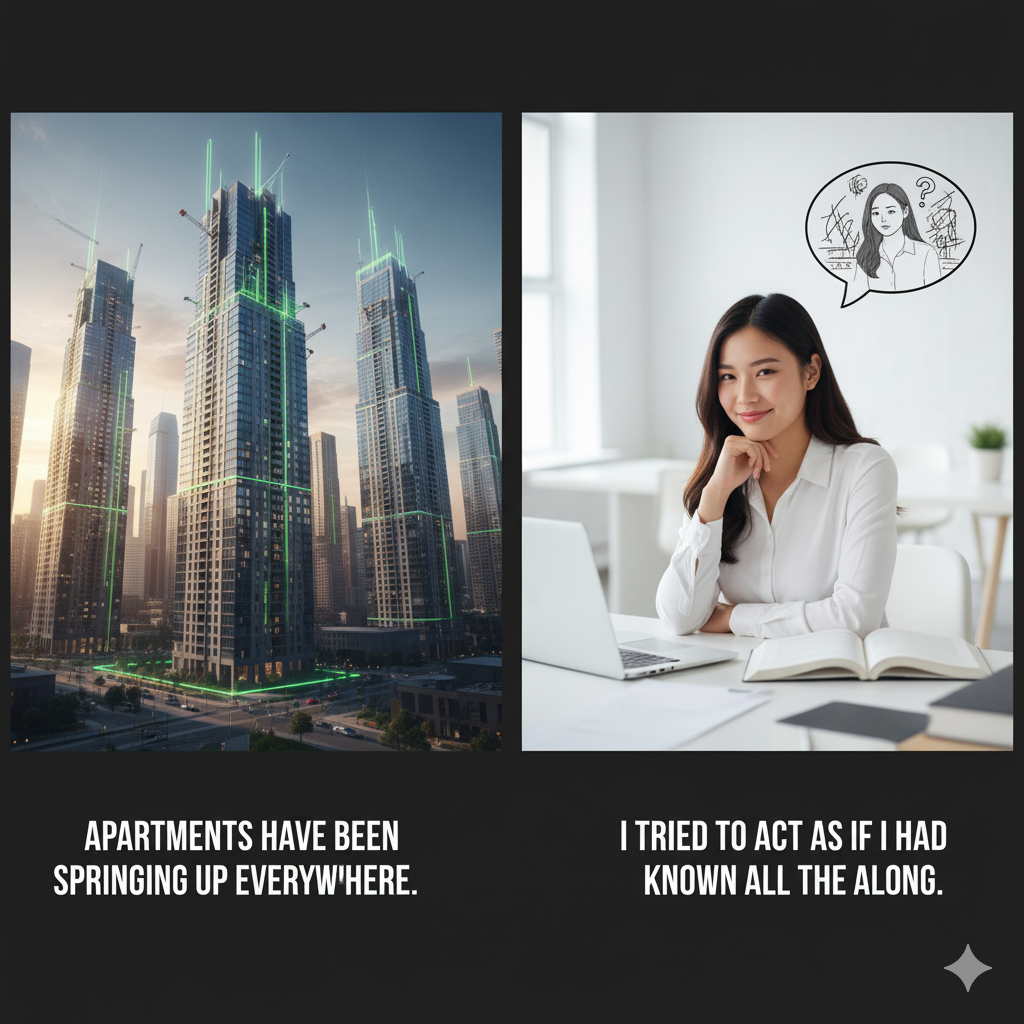 원래 문장에서는 have been springing up'이라는 현재완료 진행형을 사용했습니다. 이는 과거에 시작된 현상(아파트 건설)이 지금 이 순간까지도 계속 진행 중임을 강조합니다.